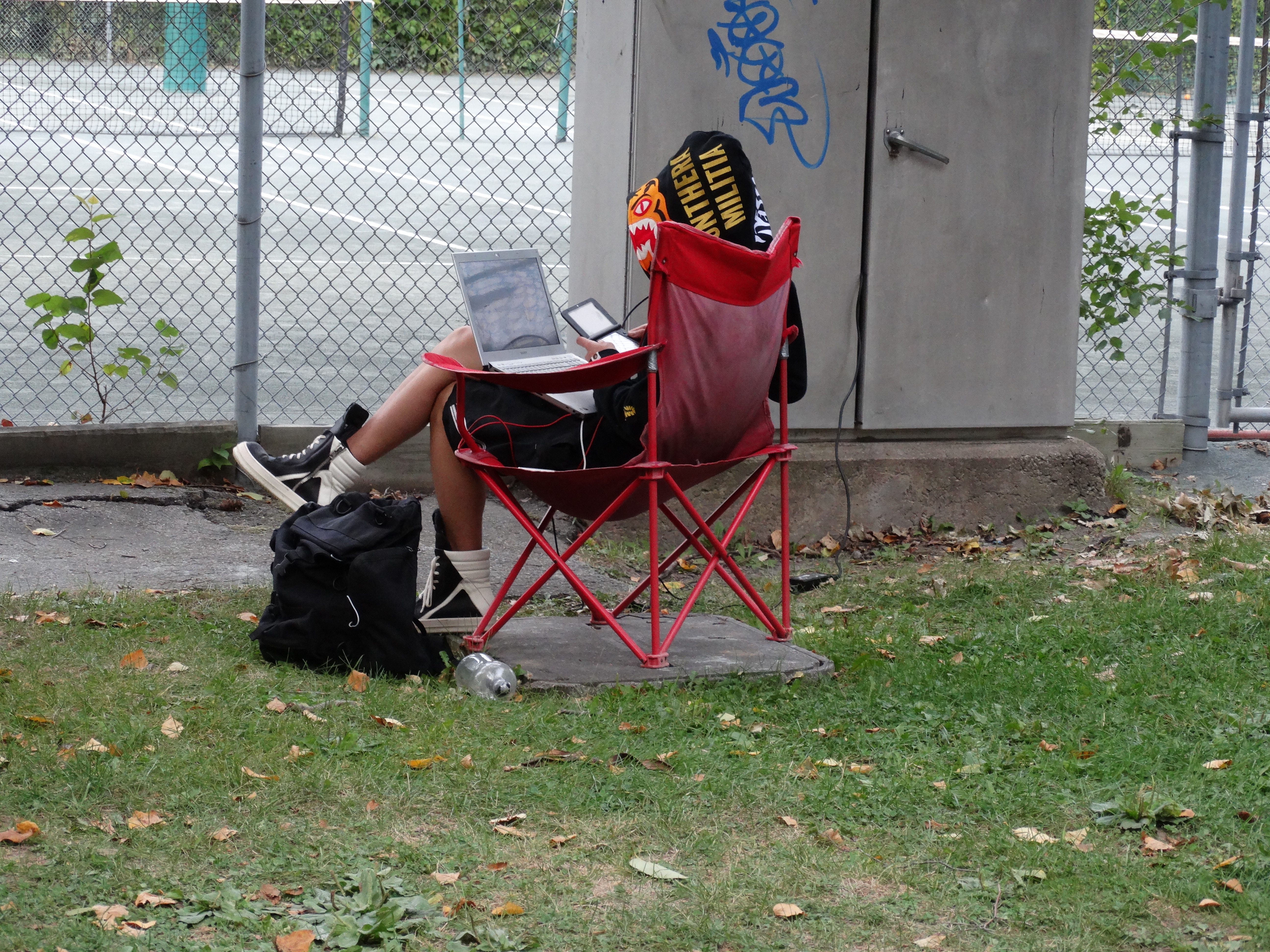 One of the clay court tennis monitors “bundled up” as the evenings are getting shorter and cooler. (I had no idea that the park has Wi-Fi!).