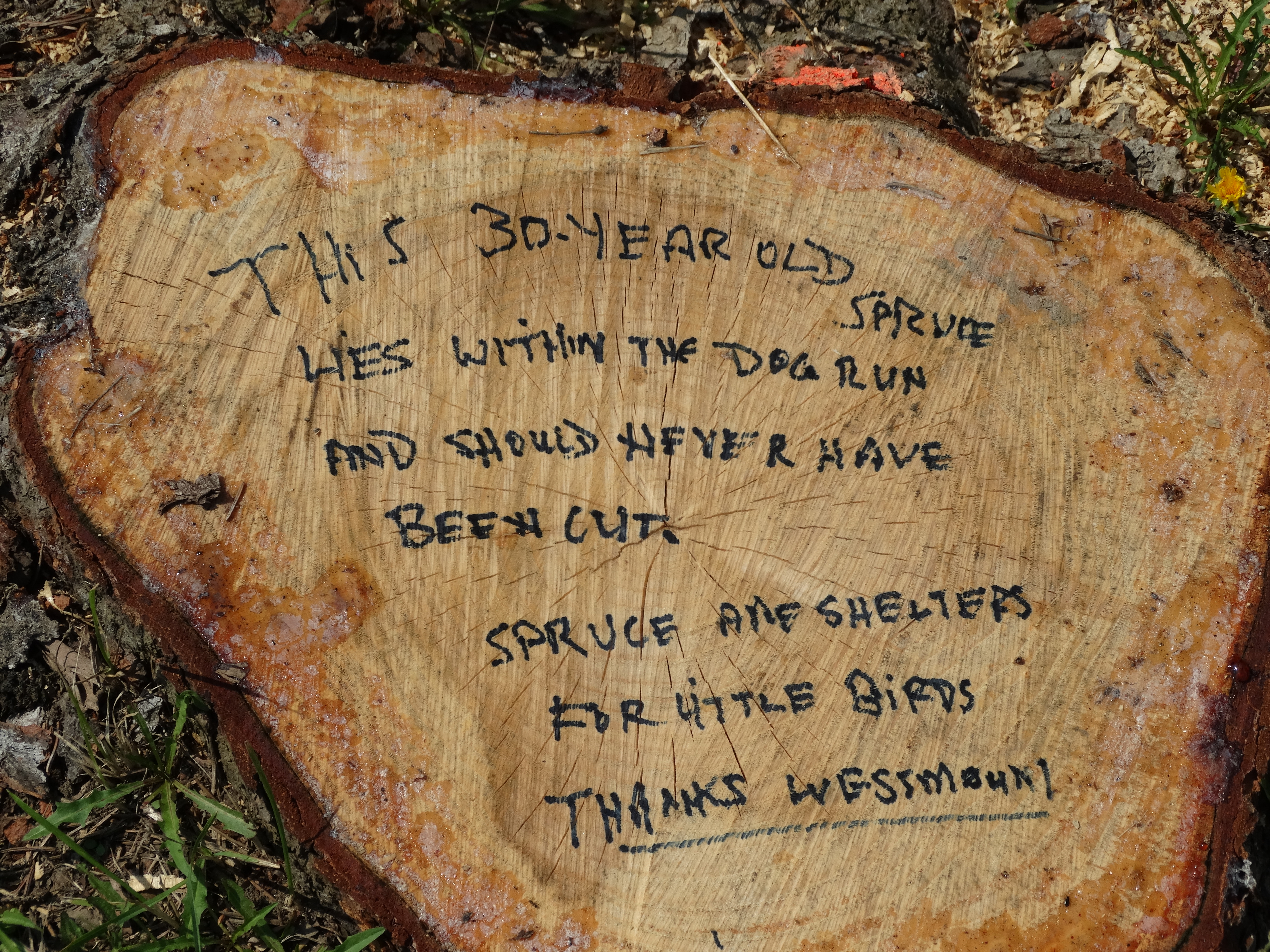 One of the truisms about living in Westmount is that any change causes a huge controversy! This was evident in on a tree stump, from a tree felled to build the park’s new dog run (and to reconfigure the bicycle path). Frankly, I agree with the comments!